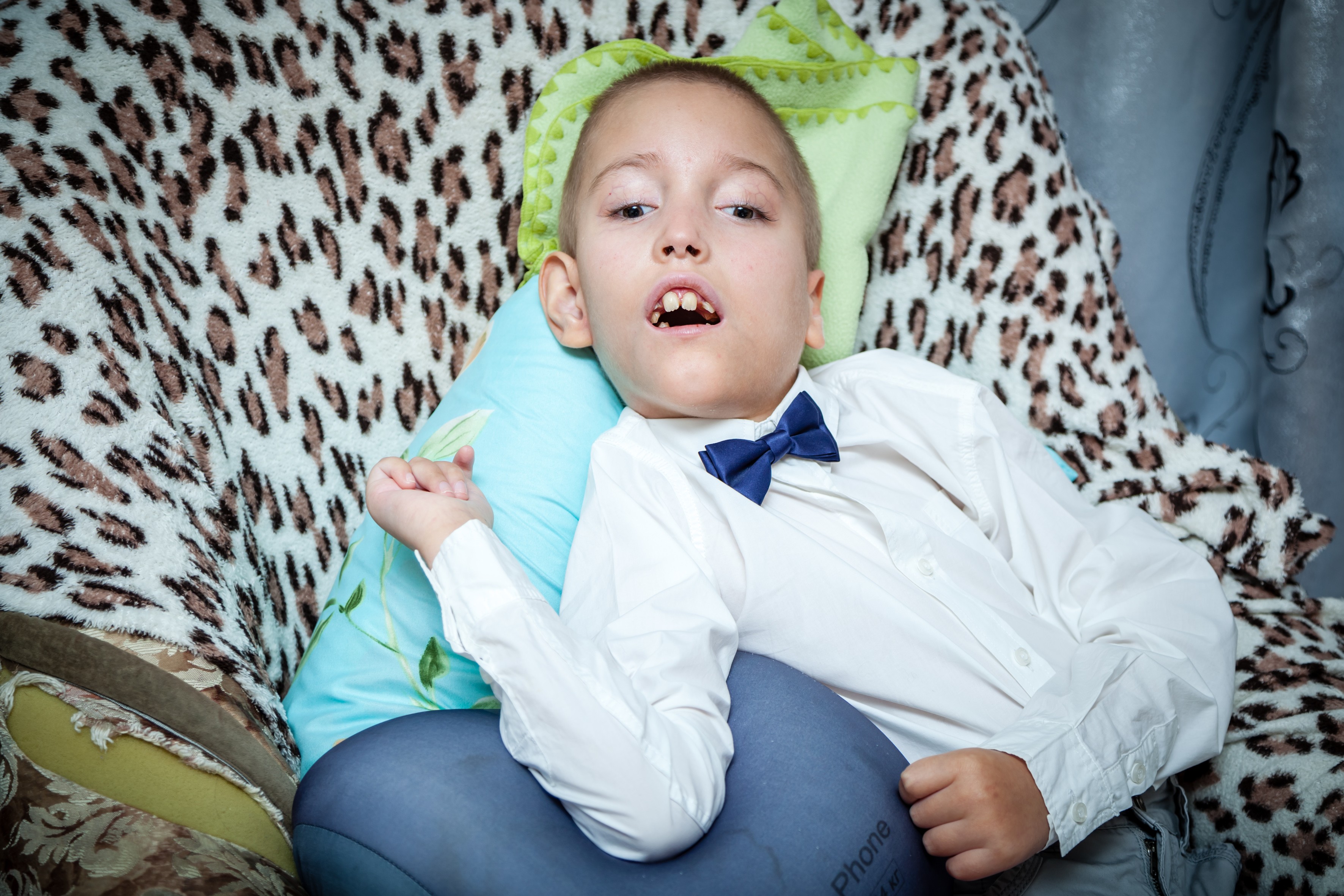 Андрею десять, но сам про свою комнату рассказать он не может: в четыре с половиной месяца он перенес менингококковую инфекцию, от болезни сильно пострадал головной мозг, развилась эпилепсия. Поэтому сейчас Андрей может только сидеть в кресле или лежать в своей комнате, он не говорит – только «поет» некоторые звуки.