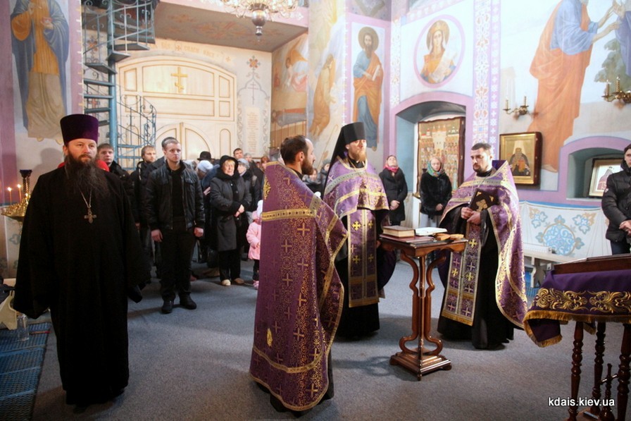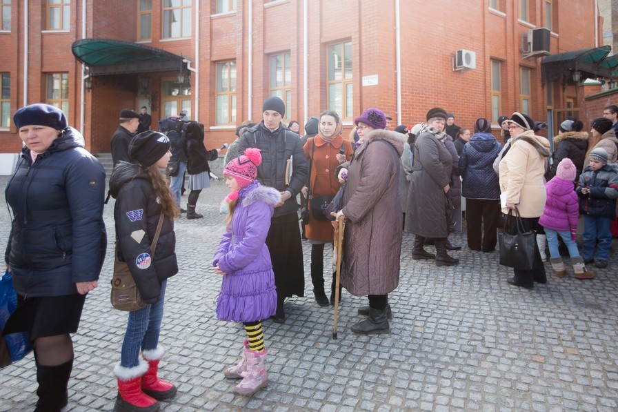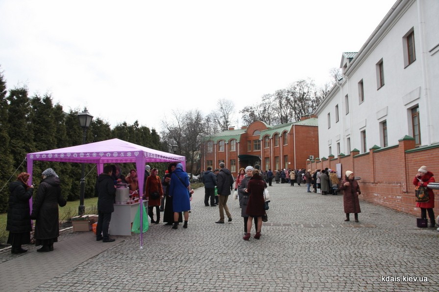Выдача гуманитарной помощи начинается с молебна в храме Рождества Богородицы Киево-Печерской лавры. Переселенцы и добровольцы вместе молятся о мире на Украине.