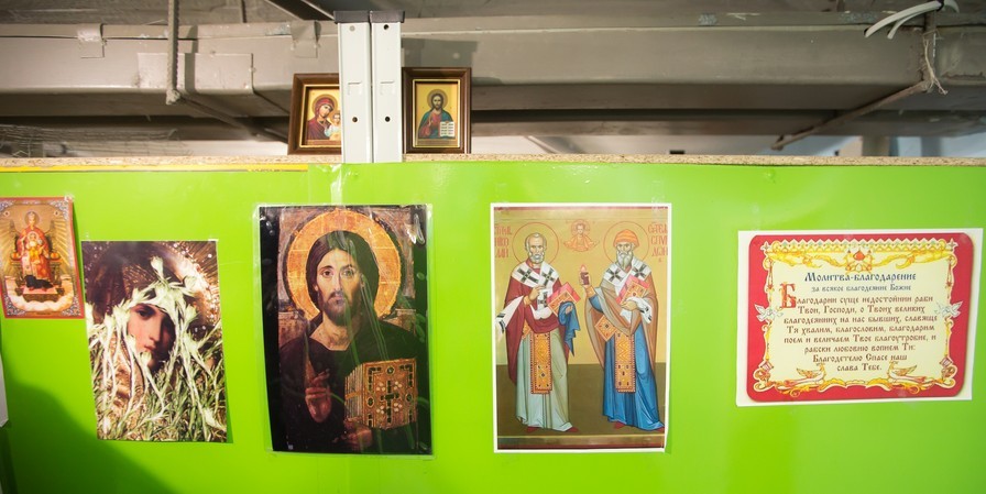 На вытяжке, которая тянется через всю комнату-склад и находится на уровне поднятой головы, маркером написаны две молитвы: «Господи, помилуй нас», «Слава Тебе, Боже наш, слава Тебе!» и нарисованы несколько смайликов. Не поклонился Творцу – приложился лбом к трубе, – объясняют ребята.