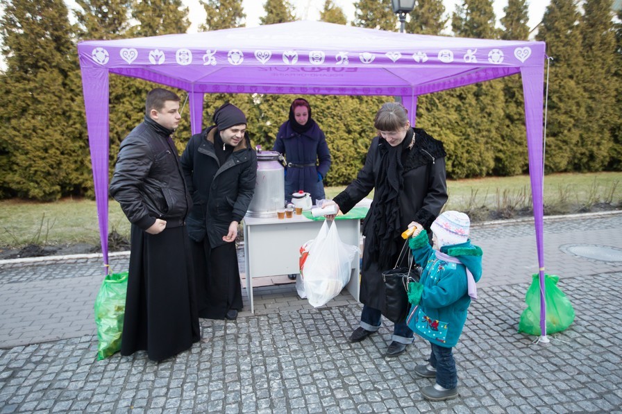 Немного растерянных посетителей на рисепшене встречают четыре улыбающиеся девушки. Проверяют копии документов, вручают продуктовые наборы и необходимые лекарства. Тяжелые пакеты девушкам-волонтерам подают семинаристы.