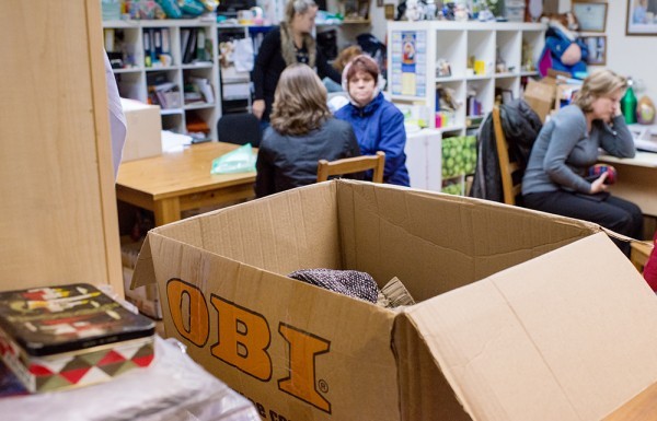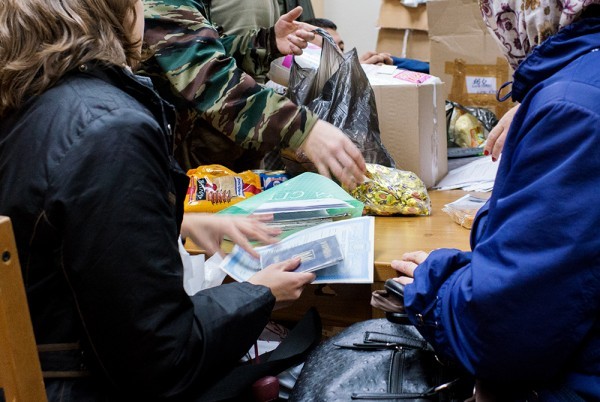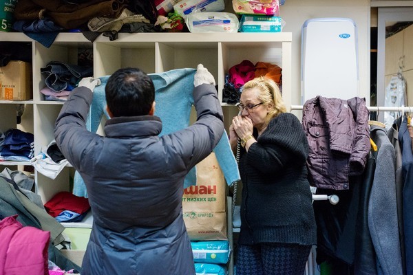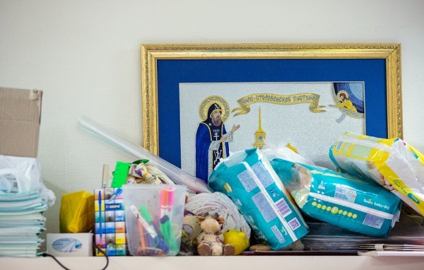 Жизнь тут просто кипит ключом. Кто-то приносит вещи, другие люди их забирают, при нас несколько раз приносили лекарства, вокруг – коробки с одеждой, упаковки памперсов.