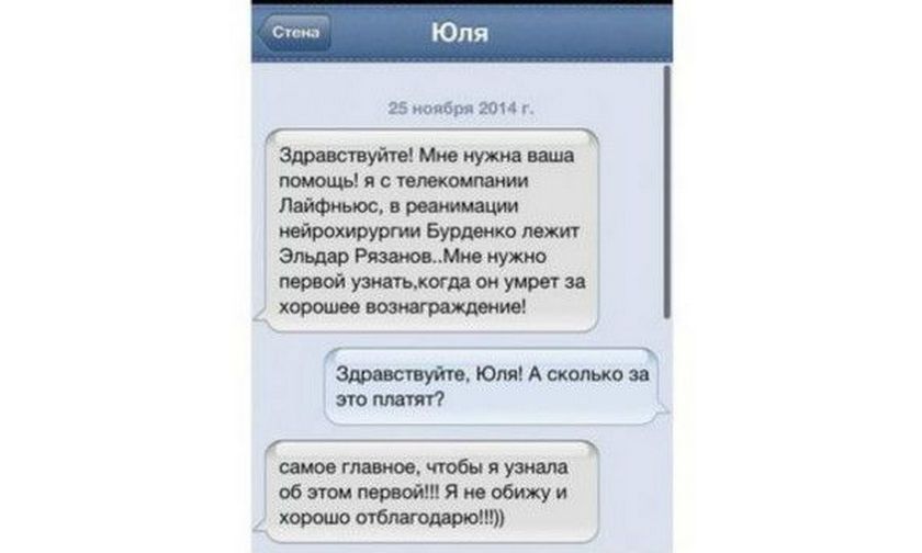 — Да, это очень известная история. Однажды мне в мессенджер одной социальной сети написала девушка. В то время в институте Бурденко в отделении нейрореанимации лежал Эльдар Рязанов после инсульта. А я тогда даже не работал там — я учился в НИИ Бурденко в ординатуре, и к тому моменту давно уже ее окончил. Девушка спросила меня, могу ли я за гонорар сообщить им информацию о нем — “когда он умрет, мы хотим узнать об этом первыми”. Я выложил эту переписку в открытый доступ. И это история имела огромный резонанс.У меня взяли комментарии все крупные СМИ, а количество моих подписчиков резко выросло.