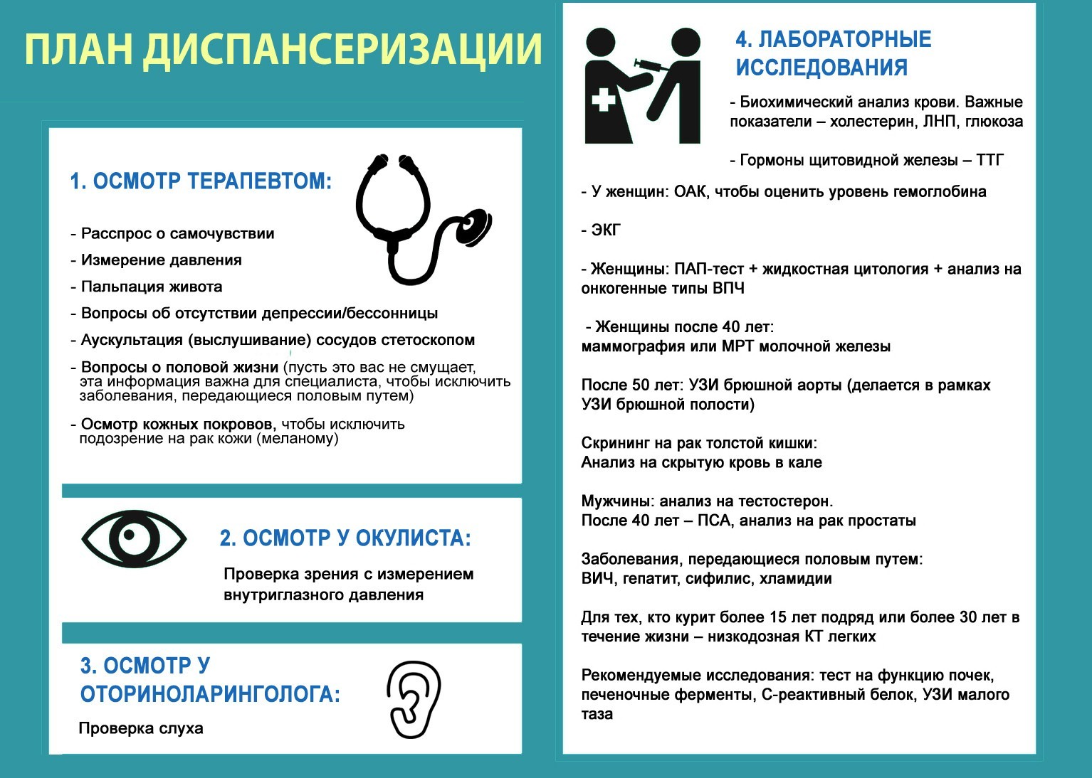 План диспансеризации для пациентов, у которых нет жалоб, отягощенного хроническими или генетическими заболеваниями семейного анамнеза
