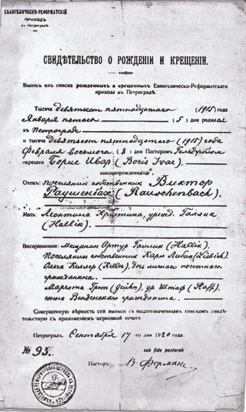 Условия жизни немецких колонистов в Поволжье привели к сближению лютеран и реформатов, чему способствовало российское правительство. Императорами Александром I и Николаем I были изданы указы, по которым лютеране и реформаты объединялись в единую Евангелическо-лютеранскую церковь, была учреждена Генеральная евангелическо-лютеранская консистория. Реформаты и лютеране крестились, причащались и венчались у одних и тех пасторов. Так, Борис Викторович ходил с матерью на Рождество и на Пасху в лютеранский храм Петра и Павла на Невском проспекте, хотя в Петербурге была и немецкая реформатская церковь. Но когда в 1922 г. пришла пора идти в школу, родители отдали его в «гугенотскую», бывшую реформатскую 34-ую школу, до которой добираться надо было более часа. По каким-то причинам он не прошел конфирмацию, следовательно, так и не стал полноправным членом реформатской церкви. В конце 1920-х гг. немецкие школы в Ленинграде были ликвидированы, немецкая реформатская церковь закрыта. Немного позже закрыт был и лютеранский храм Петра и Павла.