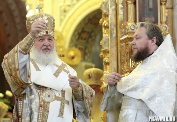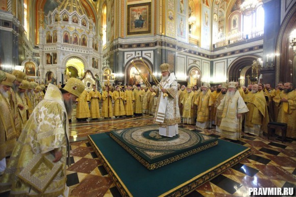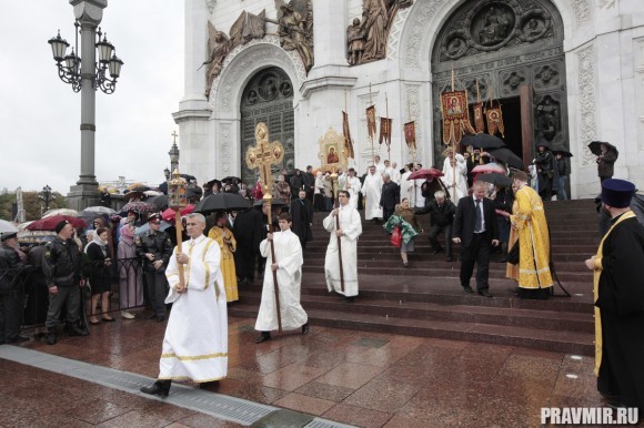 По окончании богослужения Святейший Патриарх Кирилл возглавил крестный ход и молебен перед Смоленской иконой Божией Матери на паперти Храма Христа Спасителя.