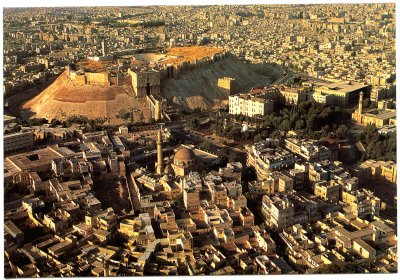 К западу от цитадели расположена Большая мечеть, построенная в 710-е годы на месте византийской базилики. Перестроенная в XII веке она потерпела значительные разрушения в 2013 году (в том числе снесен минарет 1090 года), а ведь в ней до последнего времени хранилась глава пророка Закарии, которого отождествляют со святым Захарией, отцом Иоанна Предтечи. Рядом сохранилось медресе Халавия, построенное в XII веке с использованием стен собора Святой Елены V–VI веков. В его западной части о расцвете византийского искусства в городе свидетельствует экседра (полукруглая глубокая ниша, обычно завершаемая полукуполом) с шестью колоннами.