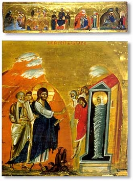 Провидел Иисус Христос Своим Божеством, что Лазарь, друг Его, умер и сказал апостолам: «Се, друг наш, Лазарь, умре». Сказал и пошел с ними в Вифанию. Когда же приближались они к Вифании, на пути встретили их Марфа и Мария; подошли они, скорбные, ко Иисусу, пали со слезами на пречистые Его ноги и горестно воскликнули: «О Господи, если бы Ты был у нас, Лазарь, наш брат, не умер бы тогда?» Благий же Господь сказал им в ответ: «Если веруете, паки жив будет». Они же, от скорби глубокой сего утешения как бы не слыша, с плачем и воплем великим говорили Ему: «Господи, Господи, брат наш Лазарь, четыре дня уже как в гробу лежит и смердит!» Тогда Зиждитель Господь, как бы не ведая, где погребен был умерший, вопросил их: «Покажите Мне место, где положили его». И со множеством многим народа изошли с Ним на гроб, и место, где погребен был умерший, Ему указали. Когда же Иисус Христос подошел к могиле, то повелел отвалить от нее лежащий на ней тяжелый камень.