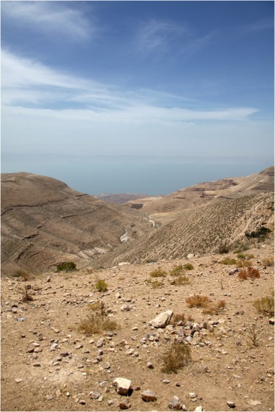 Мы стоим на смотровой площадке, откуда разворачивается «открыточная» панорама горной гряды у южной оконечности Мёртвого моря. Кажется, просматривается даже кусочек воды между склонами гор, но судить об этом наверняка трудно: палящее марево превращает здешний воздух в полупрозрачную вату, и рассмотреть что-то на большом расстоянии практически невозможно.
