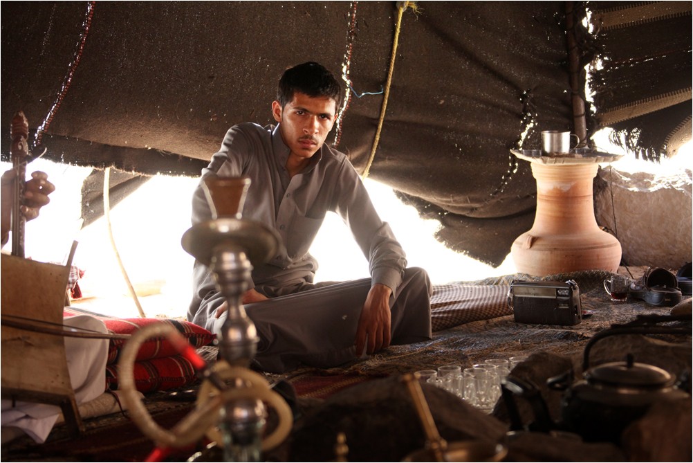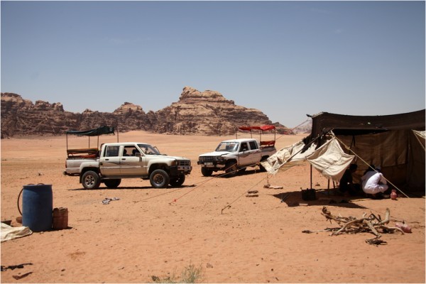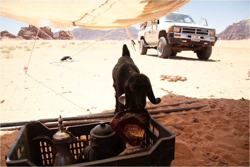 Помимо этого, местные бедуины, судя по всему, на полставки подрабатывают живыми достопримечательностями Вади Рама; видно, что для них мы — очередная группа любопытных, которых волей Аллаха занесло в эти суровые места. Немногословные молодые мужчины предлагают угощение, а потом уходят под сень палатки пить чай. Их чаепитие прерывается через пять минут: непоседливые туристы напрашиваются к ним в компанию, а еще через пару минут в палатке остаются только гости, в то время как хозяева отходят в сторонку.
