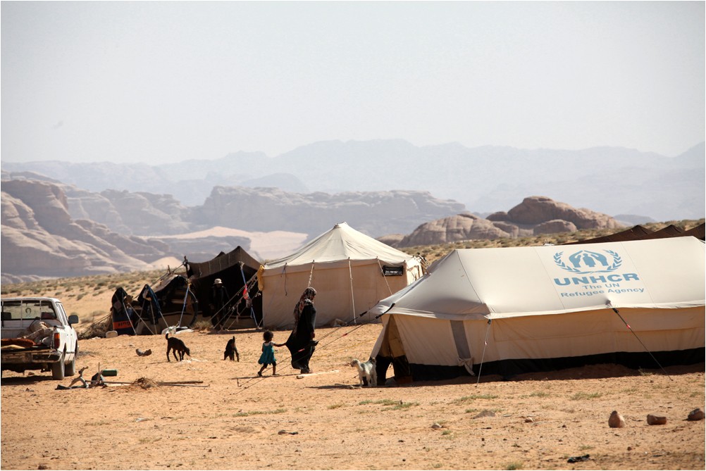 Перед большим шатром стоят ребятишки — от четырех лет и старше. Это последняя наша остановка, самый большой бедуинский лагерь из тех, что мы видели. Почти с десяток больших палаток, среди которых несколько — с надписями ооновского агентства по делам беженцев. Мы не раз ещё встретим такие по всей стране, даже на общественном пляже Акабы.