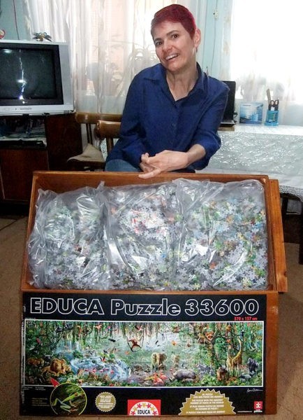 Однажды племянник, который живет в Москве, показал Людмиле веселое видео: мужчина вынес все из комнаты, чтобы собрать огромный пазл. Тогда этот пазл «Дикий мир» из 33 600 деталей был самым большим в мире. Людмила сначала не поняла, какое это имеет к ней отношение, но у племянника были наполеоновские планы: его тетя должна с этим набором войти в Книгу рекордов Гиннесса.