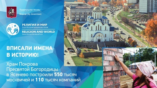 Учитывая тематику нашего форума, первый объект, на который я хочу обратить внимание – это храм, который современные москвичи построили в Ясенево в память всех русских воинов, погибших за Родину, в память о войнах, и с молитвой о мире для России. Это глубоко патриотичное начинание объединило более 500 тысяч москвичей и 110 тысяч московских компаний, внесших пожертвования на строительство храма Покрова Пресвятой Богородицы. Руками наших современников выполнено 2500 м2 византийской мозаики, и это включает объект в пятерку мировых памятников этого вида искусства.