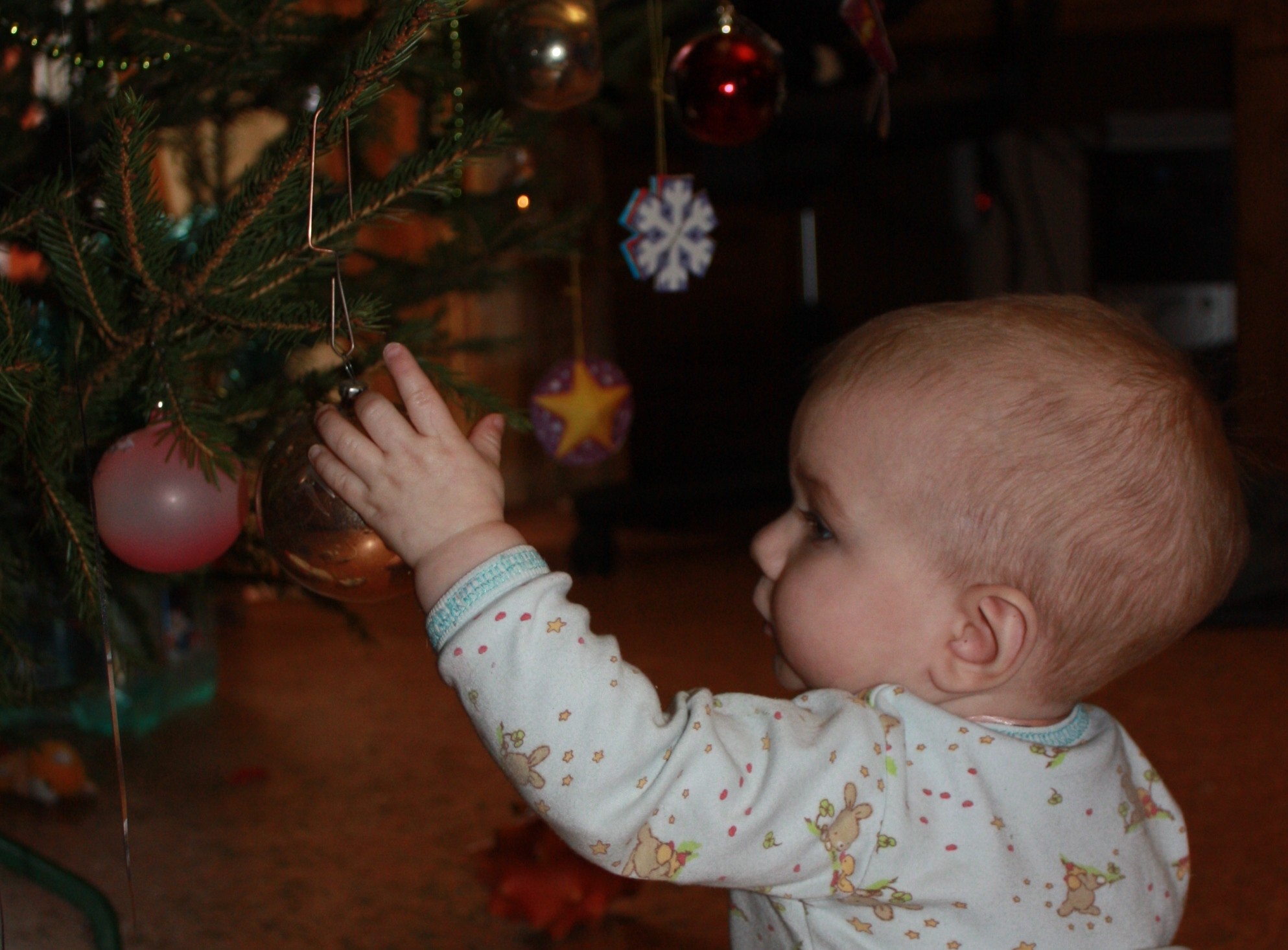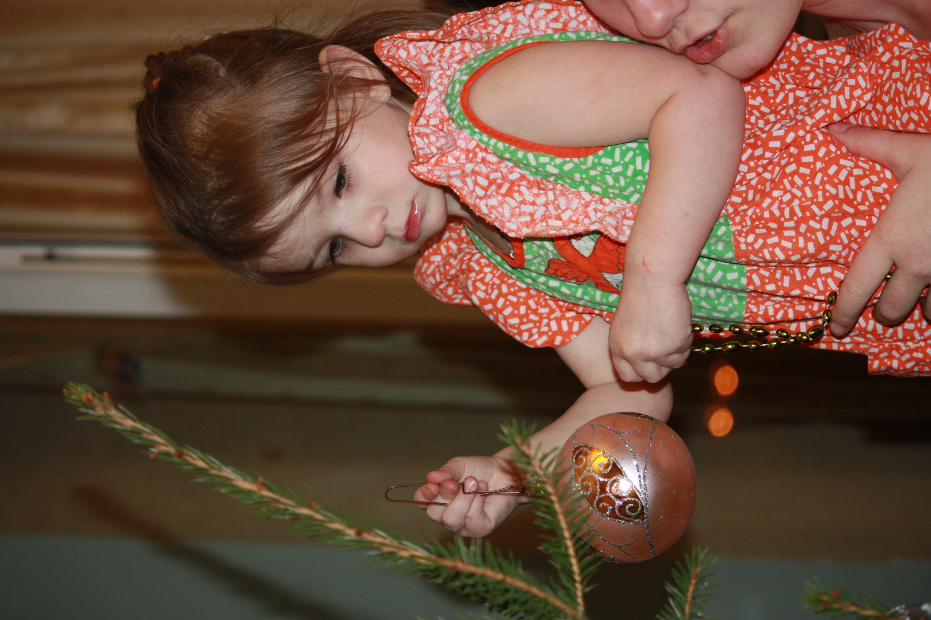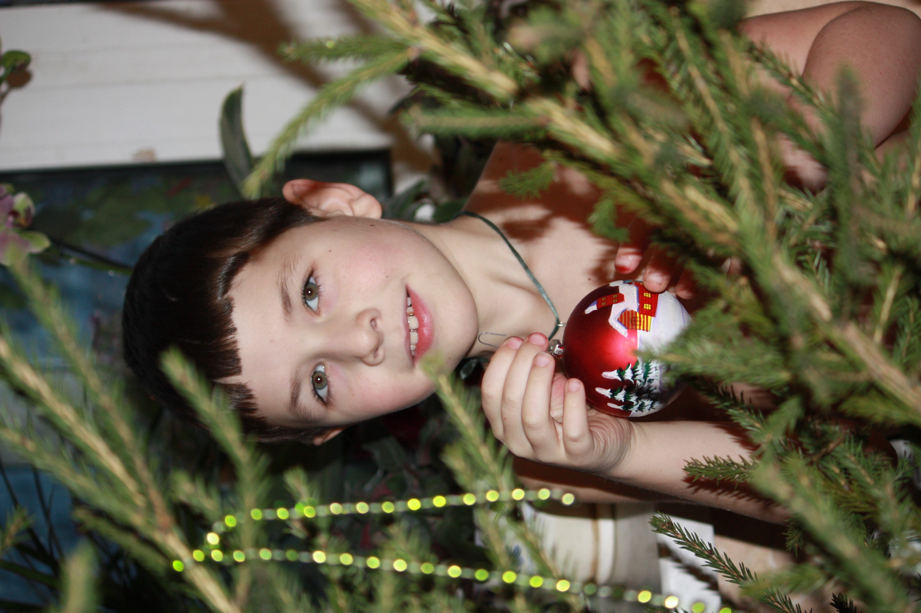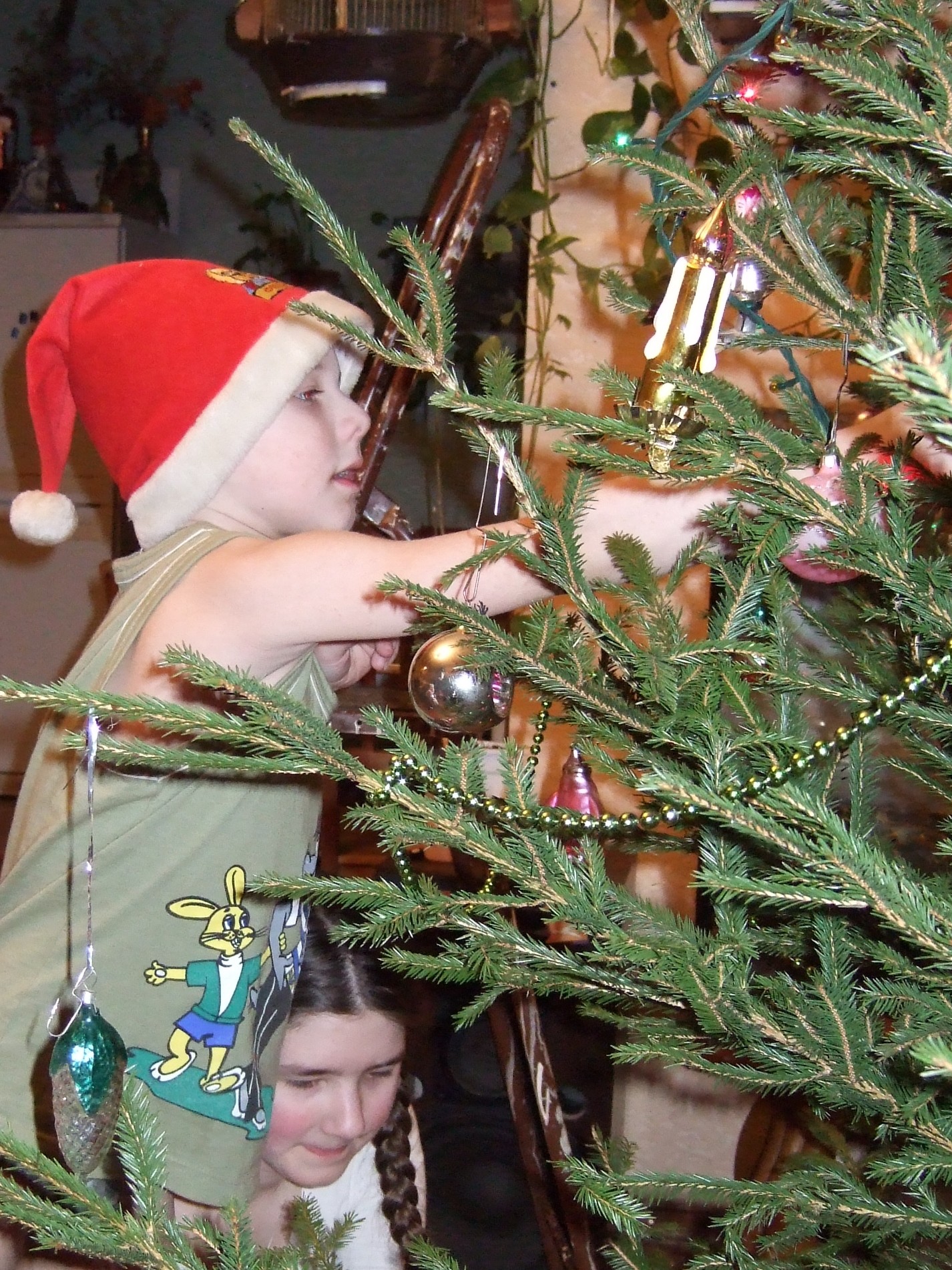 Потом мы разрешаем детям вешать игрушки. Несмотря на то, что елка у нас до потолка, и игрушек огромная коробка, все происходит так стремительно, что не успеваешь дать указания вешать большие шары на толстые ветки. Просто потом потихоньку перевешиваю все аккуратно.