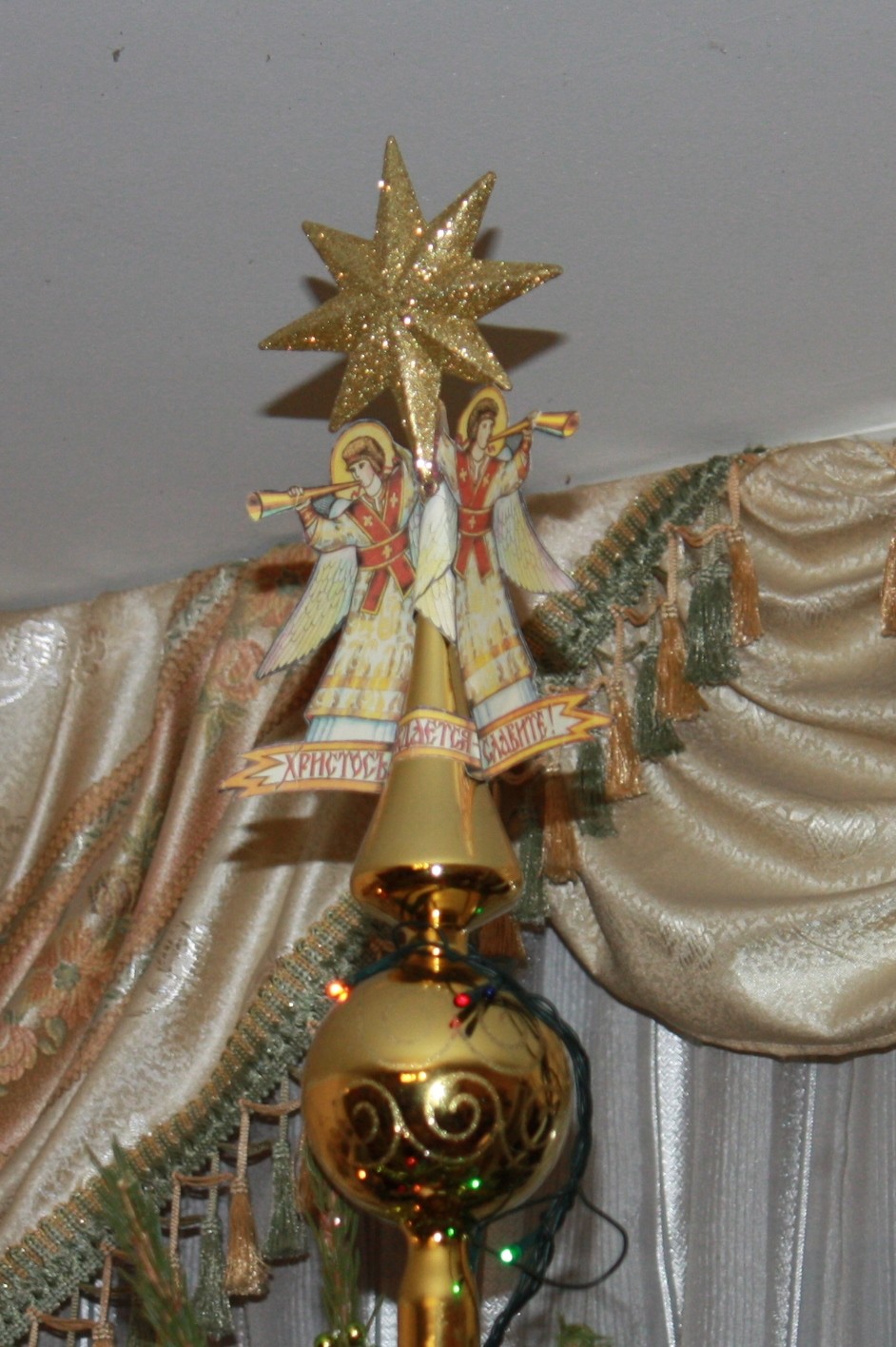 Суета, гвалт поднимаются неимоверные. Детей призвать к порядку практически невозможно. Разве только угрозой отстранить от развешивания игрушек. После того, как елка установлена и закреплена, батюшка водружает на макушку звезду с ангелами. Эту звезду мы делали сами, потому что не нашли в продаже восьмиконечной.