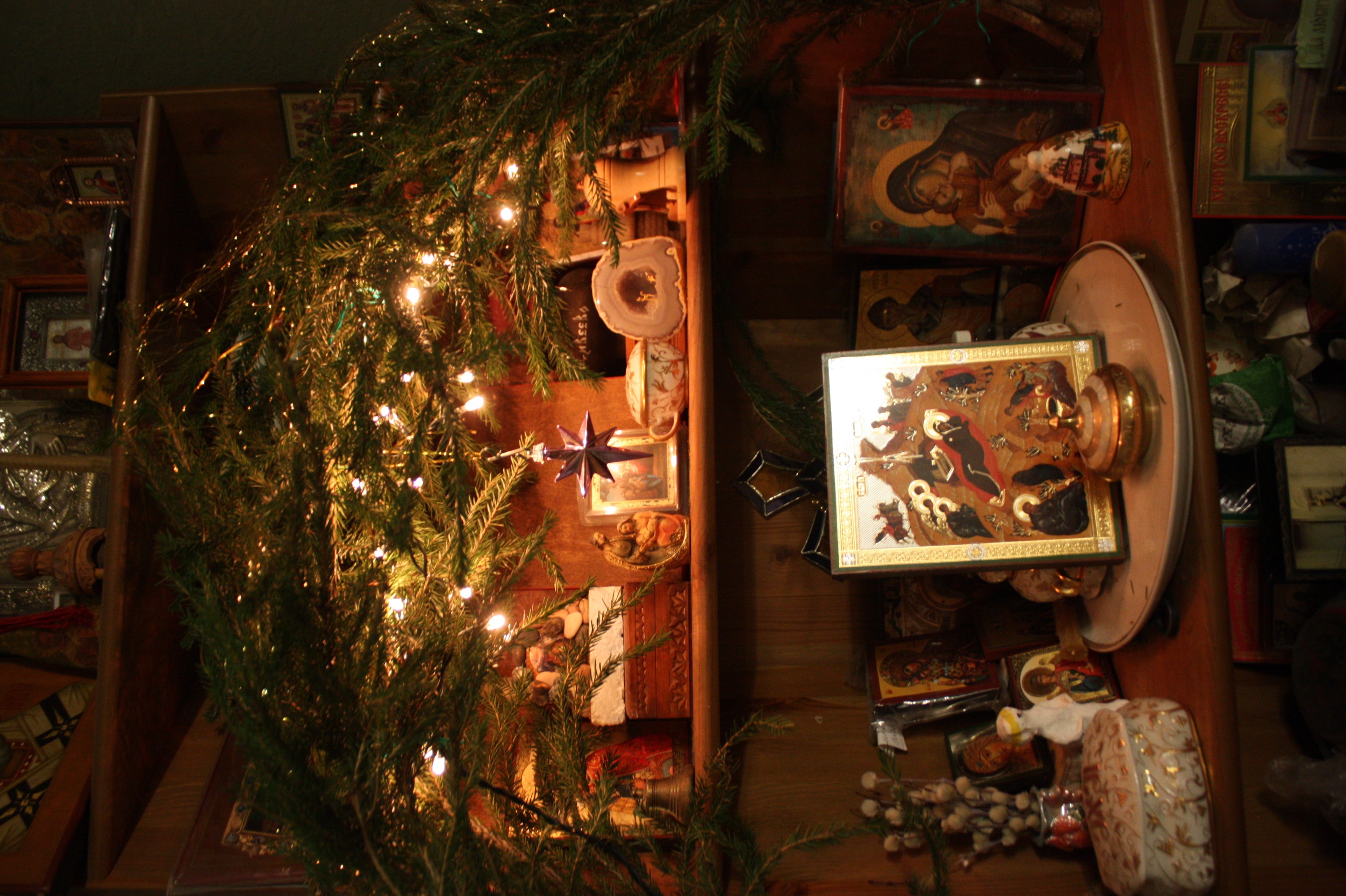 Но вернемся к празднику. Из обрезанных от елки веток делаем вертеп. Делаем его прямо в святом углу в гостиной в виде пещерки. Дополнительно украшаем гирляндой с белыми огоньками. Ставим икону Рождества. Есть у нас небольшая коллекция маленьких вертепов, подаренных друзьями. Их тоже выставляем в святом углу или под елками в детских.