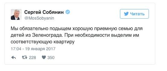 В тот же день мэр Москвы Сергей Собянин в своем твиттере написал: «Мы обязательно подыщем хорошую приемную семью для детей из Зеленограда. При необходимости выделим им соответствующую квартиру».