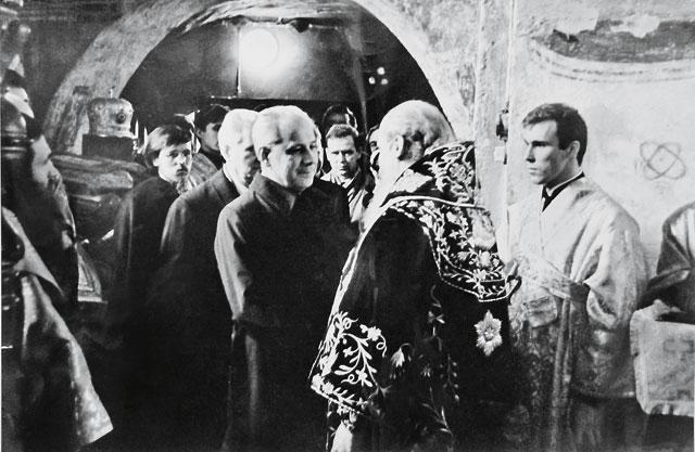 Успенский собор Кремля, 1990 год. Слева от Патриарха Алексия II — председатель Верховного Совета СССР Анатолий Лукьянов, референт Патриарха Андрей Кураев, первый зампредседателя Моссовета Сергей Станкевич (на заднем плане). Слева — предстоятель румынской православной церкви патриарх Феоктист. Фото из личного архива протодиакона Андрея Кураева