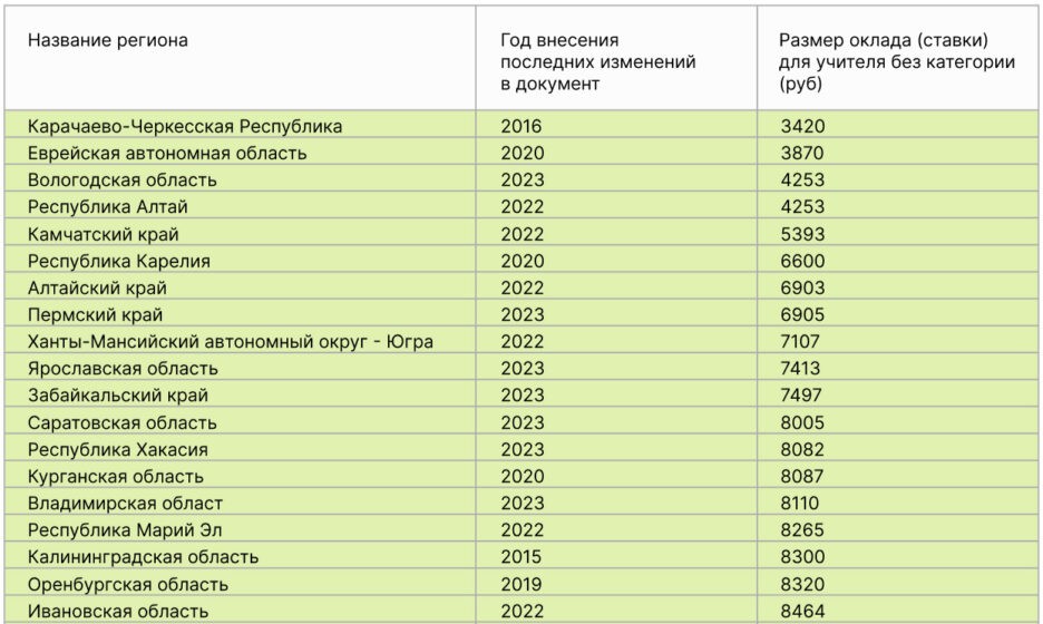 Наш профсоюз недавно провел большое исследование и проанализировал оклады учителей по регионам. Это очень низкие цифры, в подавляющем большинстве случаев они ниже МРОТ, иногда 7–9 тысяч рублей. Конечно, за счет надбавок и высокой нагрузки педагоги получают выше МРОТ, но оклад — это гарантированная часть оплаты труда за ставку, он не должен быть ниже МРОТ.