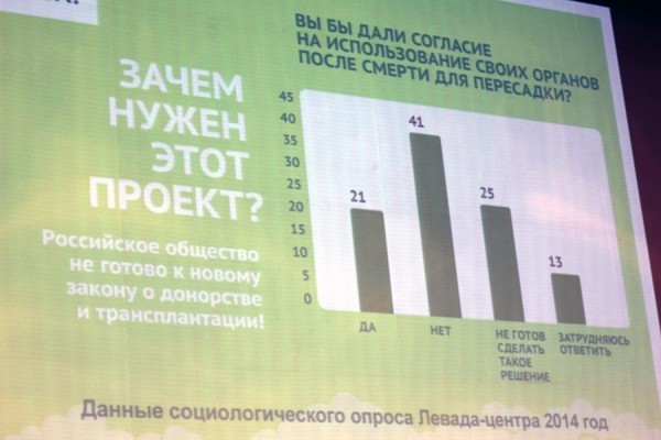 Председатель Межрегиональной общественной организации нефрологических пациентов «НЕФРО-ЛИГА» Людмила Михайловна Кондрашова презентовала проект «Трансплантация? Я — за!». Целю проекта является положительное отношение общества к органному донорству и трансплантации.