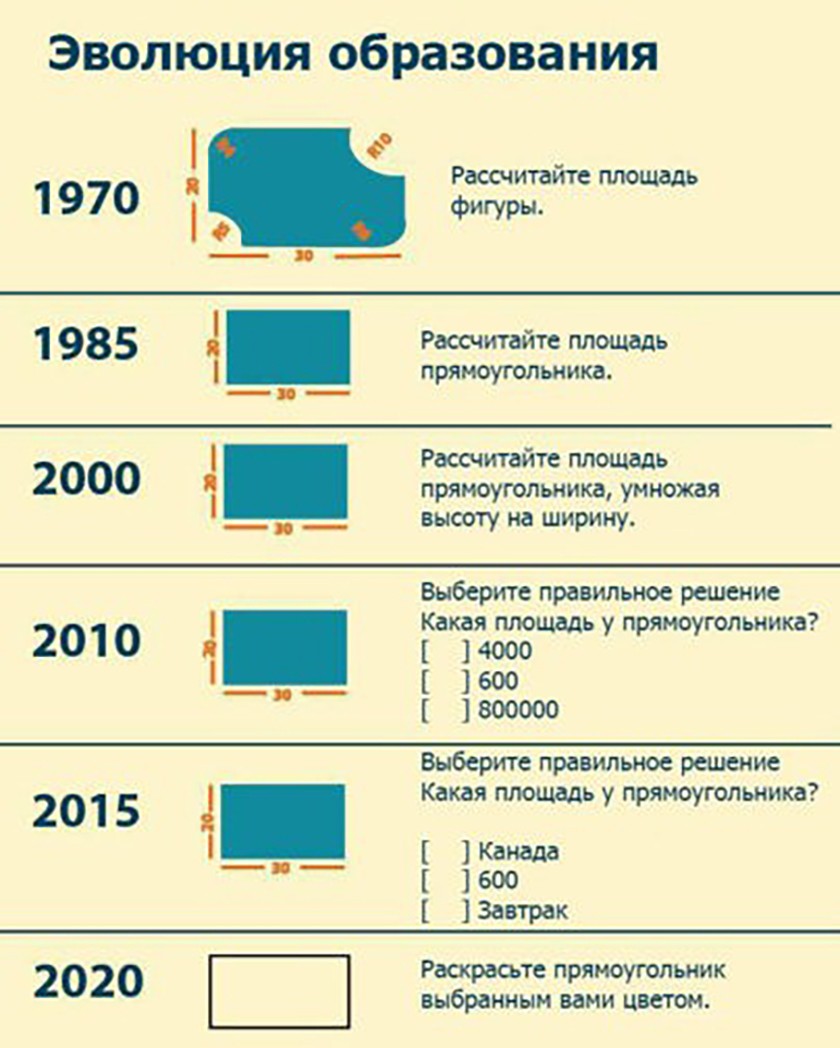 — Знаете, если вбить в поисковую систему слова «раньше образование», то она автоматически продолжит «было лучше». И с одной стороны, на дистанте дети вроде бы стонут от нагрузки, с другой — по мессенджерам продолжают ходить картинки, что раньше мы вычисляли площадь сложной фигуры, а сейчас надо закрасить прямоугольник. Мол, из детей делают не очень умных людей. Что вы об этом думаете?