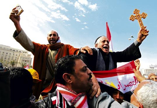 Какая судьба ждет египетских христиан – коптов в новом Египте? Несмотря на заявления о поддержке режима Мубарака со стороны ряда церковных авторитетов, христиане вместе с мусульманами стояли на площади Тахрир. С ними стояли и священники. Мусульманские молитвы чередовались с христианскими, и случаев межрелигиозных столкновений замечено не было. Копты требовали того же, что и остальные жители Египта – работы, хлеба, политических свобод. В ходе событий Братья как самая влиятельная социальная организация взяли на себя обеспечение восставших продовольствием и медикаментами, оказывали бесплатно медицинскую помощь не только мусульманам, но и христианам, попутно рассказывая им о миролюбии ислама и общности целей и задач всех собравшихся. Многие из христиан, конечно, боятся прихода к власти радикалов, однако, в любом случае большинство из них выбрали грядущую неизвестность вместо опостылевшей действительности. Тем более, что грядущие свободные выборы позволят коптам как меньшинству обратиться за поддержкой к Западу и постараться получить побольше мест в парламенте, что позволит активнее защищать интересы своей общины.