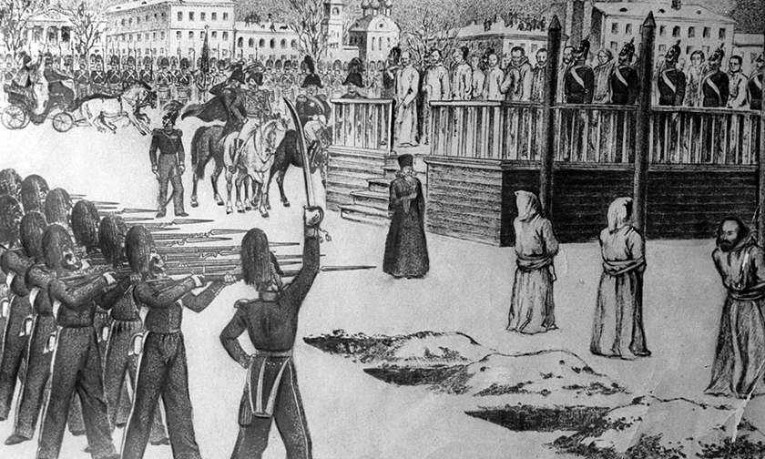 По процедуре к столбам выводили по трое. Достоевский был шестым. Когда первую «тройку» облачили в саваны, а солдаты с заряженными ружьями встали напротив них, «вдруг» прискакал фельдъегерь и объявил помилование. Один из осужденных, Николай Григорьев, который ждал выстрела уже с мешком на голове, сошел с ума.