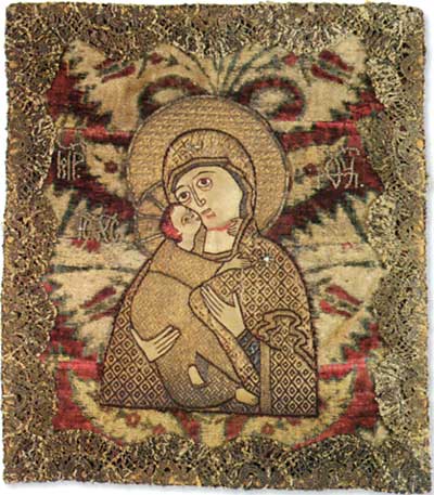 Владимирская икона, привезенная в Киев около 1130 года из Византии, на Руси неоднократно поновлялась. От первоначальной живописи сохранились лики Богоматери и Младенца, часть Его правой руки и кисть левой, а также небольшие фрагменты синего чепца и темно-красного мафория Девы, часть охряного хитона Христа и виднеющаяся из-под него рубашка.