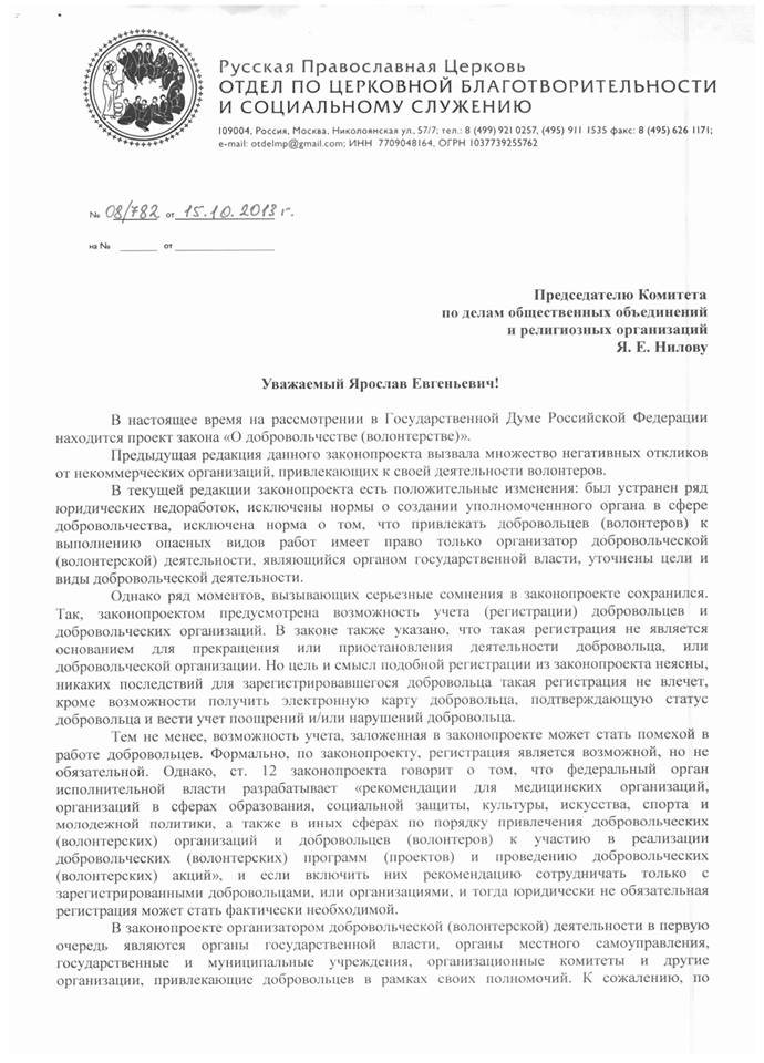 В частности, речь идет о предусмотренной законопроектом возможности учета (регистрации) добровольцев и добровольческих организаций. По мнению епископа Пантелеимона, цель и смысл подобной регистрации неясны, однако заложенная в законопроекте возможность учета может стать помехой в работе добровольцев.