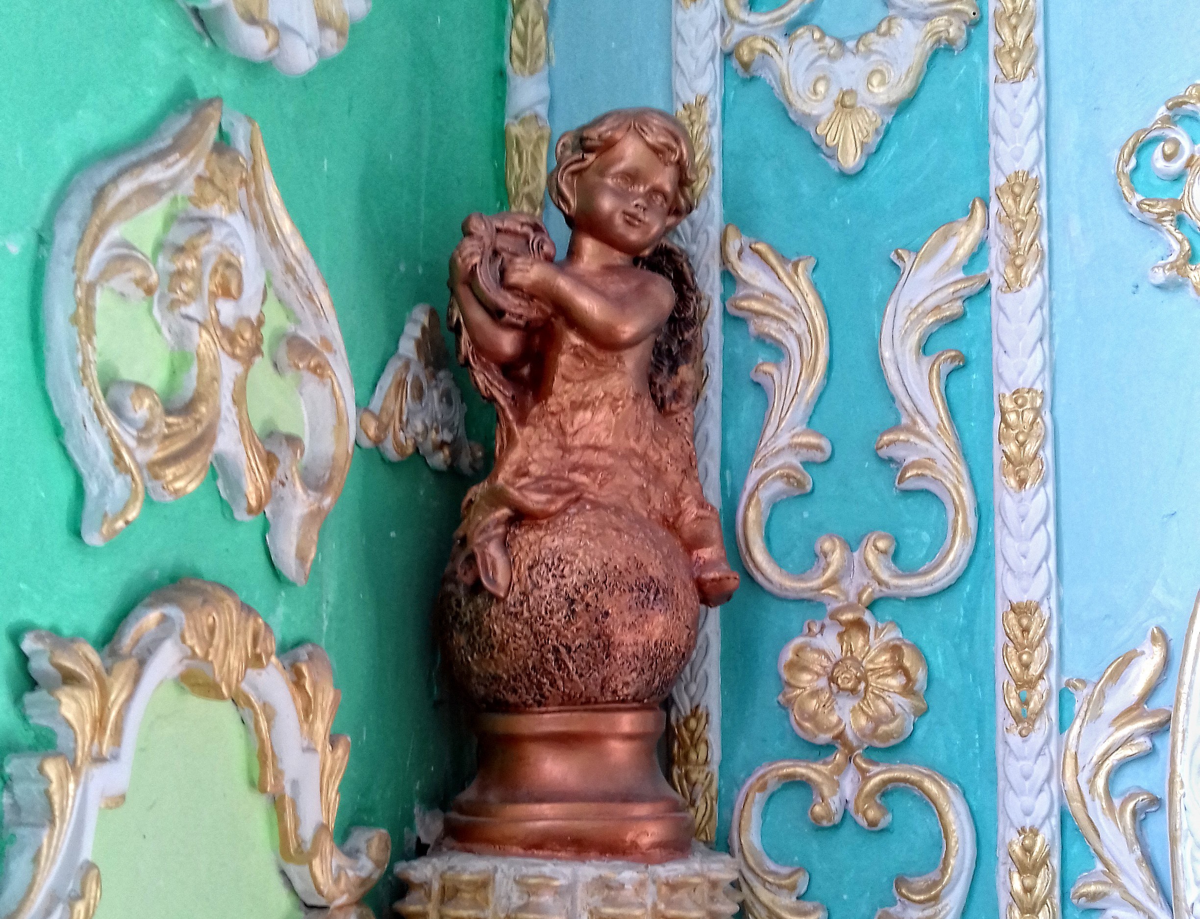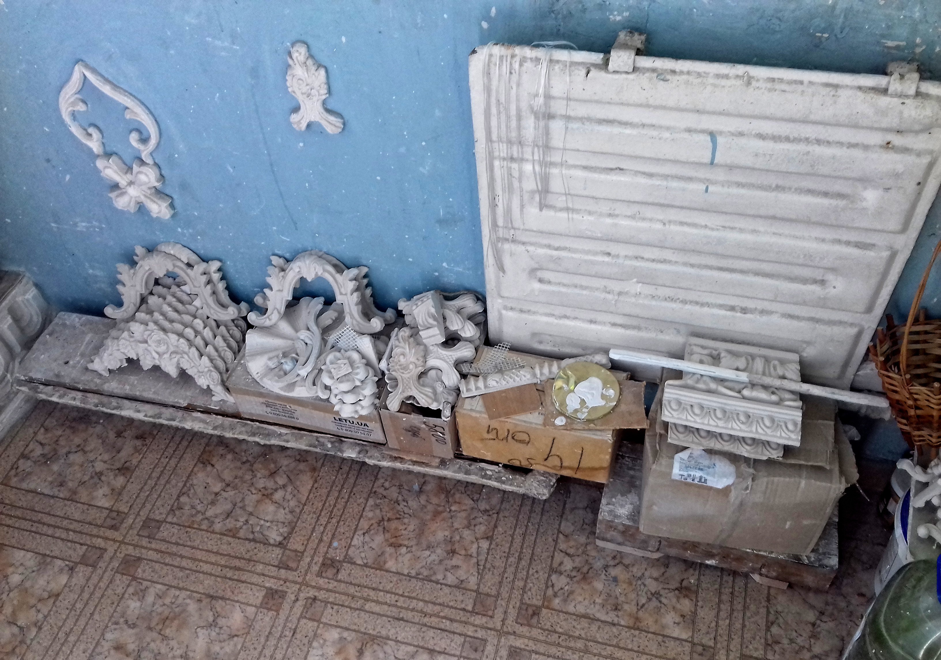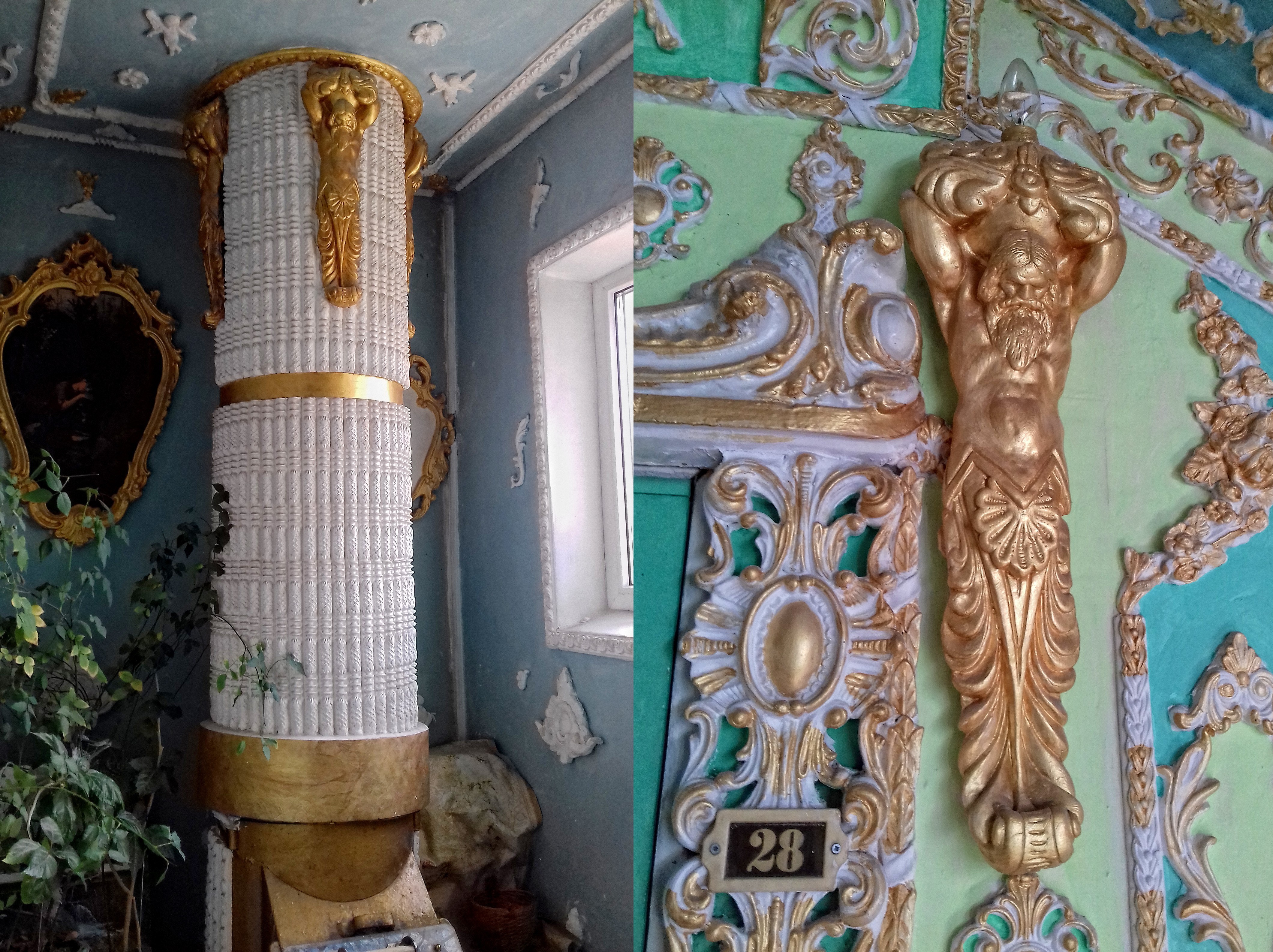 Предмет особой гордости — мусоропровод, который по желанию пенсионера-энтузиаста превратился в колонну с атлантами, покрытыми золотой краской. Возле нее, кстати, лежат заготовки для будущих композиций. Богато украшены даже входы в лифт и сама кабина, где тоже висят картины. Было еще зеркало, но разбилось (а может, разбили).