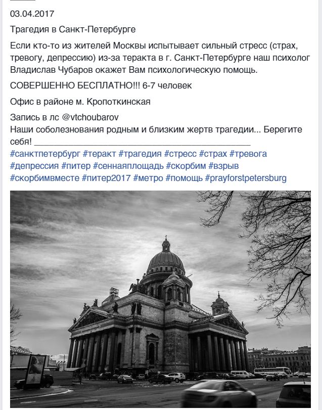 В епархии очень быстро принимают решение направить священников в четыре больницы, в которые отвозят пострадавших, для оказания духовной помощи. В это же время частные психологи в фейсбуке и Вконтакте оставляют сообщения о готовности провести дистанционную консультацию тем, кому требуется психологическая помощь.