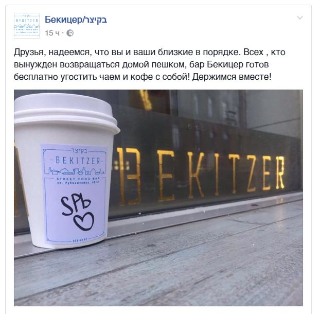 Кафе и кофейни предлагают бесплатные кофе и чай. Одними из первых реагируют ребята из израильского кафе “Бекицер” на Рубинштейна: “Друзья, надеемся, что вы и ваши близкие в порядке. Всех , кто вынужден возвращаться домой пешком, бар Бекицер готов бесплатно угостить чаем и кофе с собой! Держимся вместе!”.