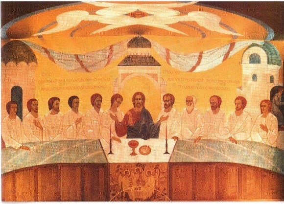 Посреди апостолов, в центре — Совершающий все это, Он Самый, Бог Илии, Приносяй и Приносимый за жизнь мира, в ало-синих ризах — Жертвы жертв, Бога и Человека, Христос Бог — Он Самый.