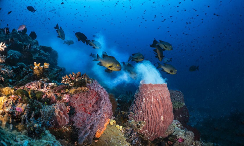 Облака белой икры клубятся вокруг гигантской бочкообразной губки – редкое и мимолетное явление, которое вдохнуло новую жизнь в риф. Фото: Aaron Sanders