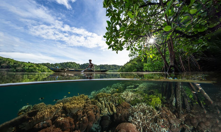 Индонезия, житель папуасской общины проплывает над коралловым рифом. Фото: Wendy Mitchell
