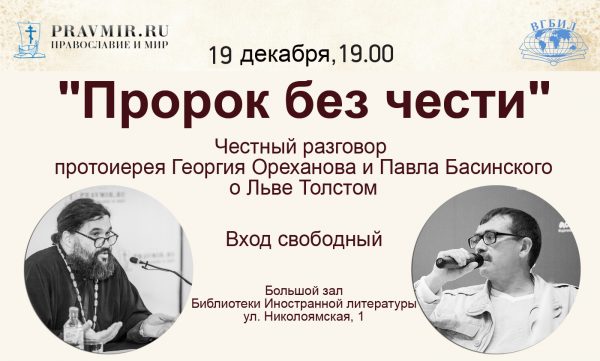 19 декабря в 19.00 в Большом зале Библиотеки Иностранной литературы состоится дискуссия протоиерея Георгия Ореханова и Павла Басинского о Льве Толстом.