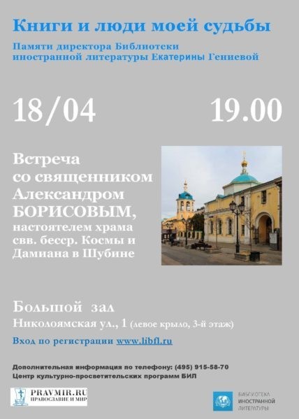 Библиотека иностранной литературы и интернет-портал «Правмир» продолжают цикл встреч «Книги и люди, определившие мою жизнь» памяти директора Библиотеки иностранной литературы Екатерины Юрьевны Гениевой