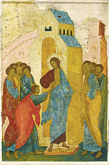 И вокруг стоят апостолы, и у всех обуты ноги в сандалии – как прекрасны ноги благовествующих (Ис. 52:7; Рим.10:15) ! Ученики Христовы скоро пойдут по дорогам, свидетельствуя о Тайне Его, совершая Тайну Его…