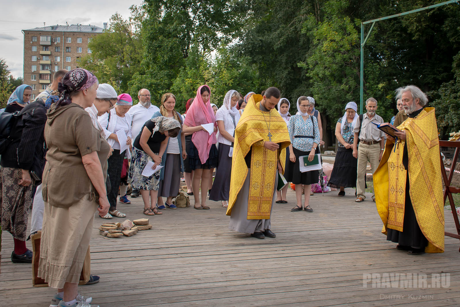 Перед началом молебна староста храма Всемилостивого Спаса Владимир Простов проводит экскурсию для всех желающих: подводит к вырытым посреди холма ямам и разъясняет, как располагалась историческая церковь. Вот остатки поперечной стены, вот здесь был алтарь, примерно здесь — престол, а дальше, в третьей яме, вход в подклет, то есть на цокольный этаж.