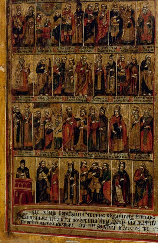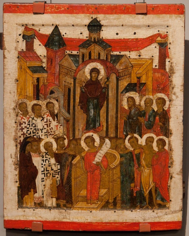 Явление Богоматери и святителя Николая пономарю Юрышу. Около 1600 года. Происходит из погоста Лядины Каргопольского района. Собрание Н.В.Задорожного (Москва). Верхняя часть двухрядной иконы Введение во храм. Первая половина XVII века. Русский Север. Собрание Н.В.Задорожного (Москва).