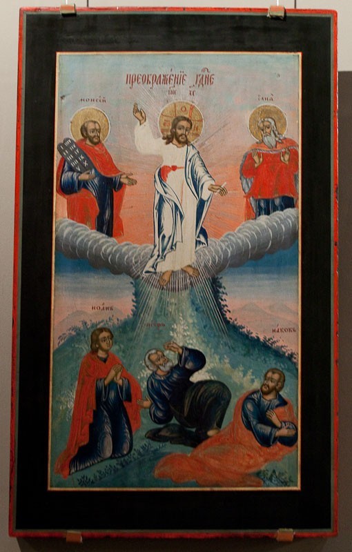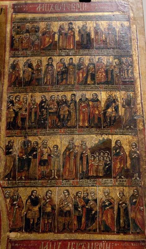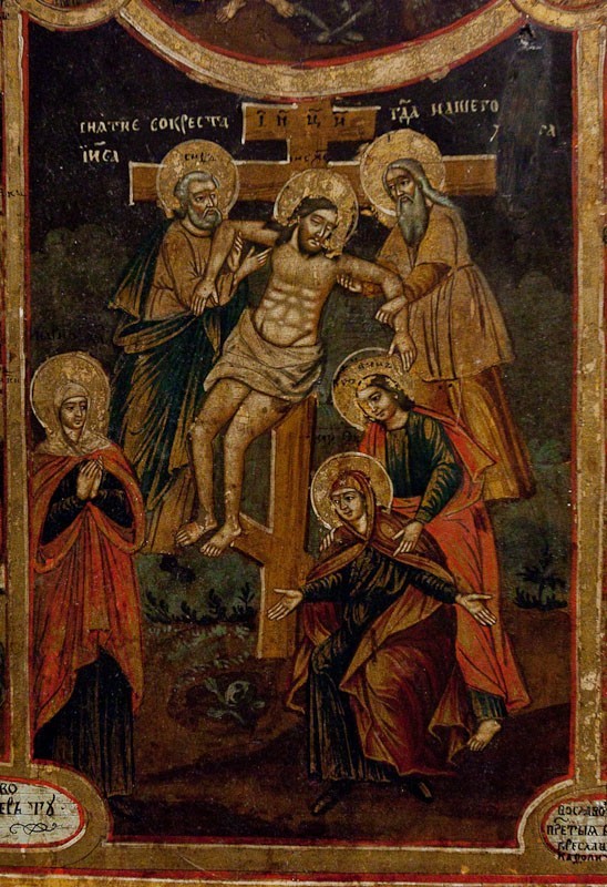 Верхний ряд иконостаса. Крест-Распятие с предстоящими в медальонах. Предстоящие: вторая половина XVIII века. Крест-Распятие: конец XVIII века. Музей русской иконы (Москва). Инв. № ЧМ-244-248,325.