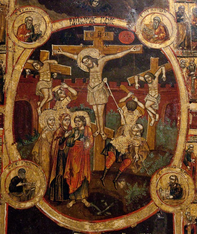 Верхний ряд иконостаса. Крест-Распятие с предстоящими в медальонах. Предстоящие: вторая половина XVIII века. Крест-Распятие: конец XVIII века. Музей русской иконы (Москва).