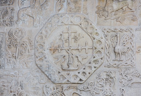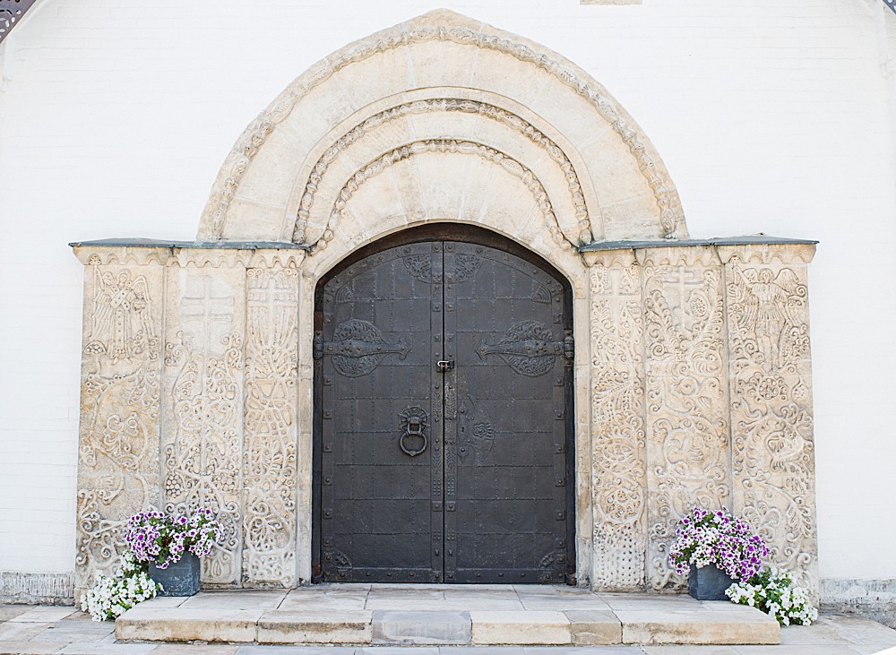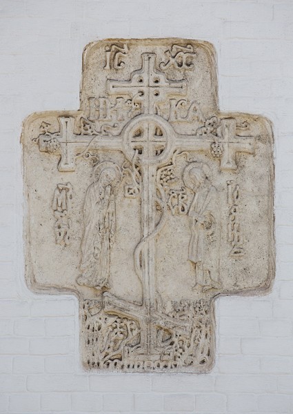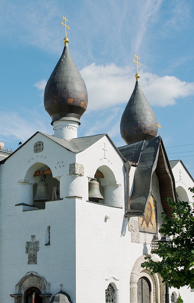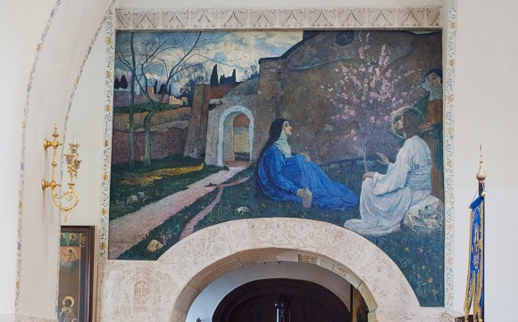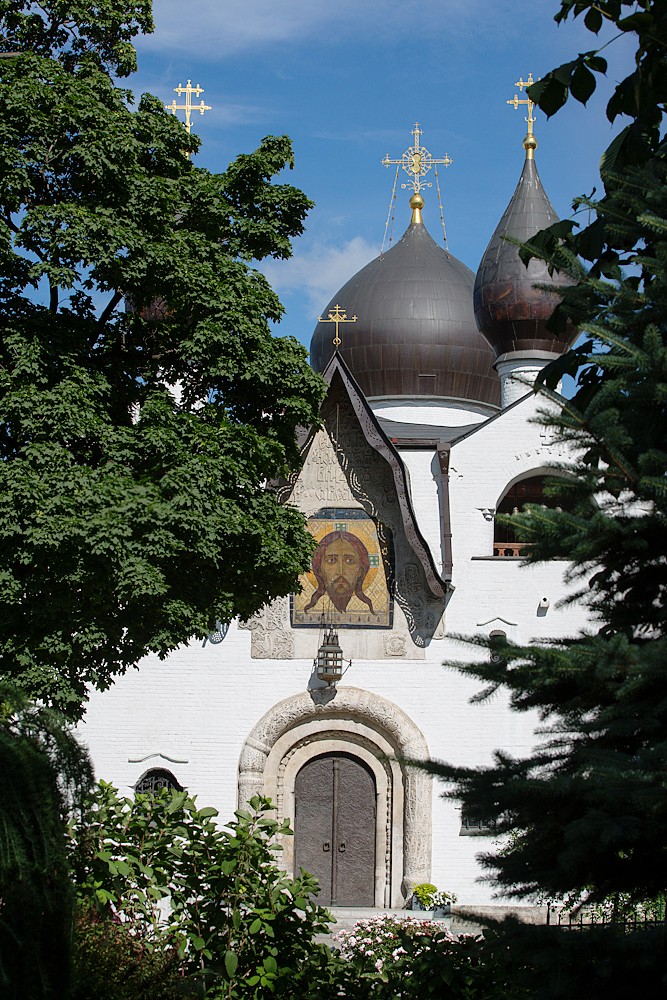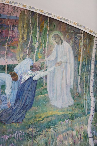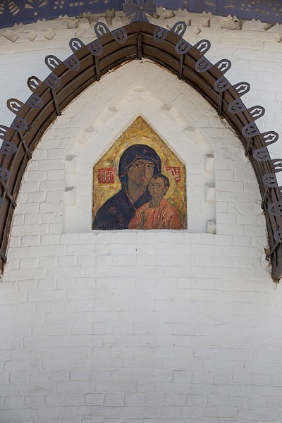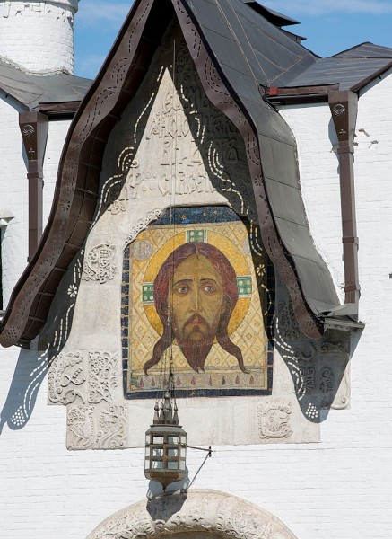 Между звонницами над порталом помещен мозаичный лик Спасителя, выполненный по рисунку М. В. Нестерова