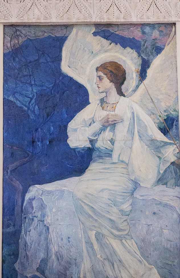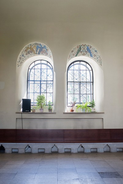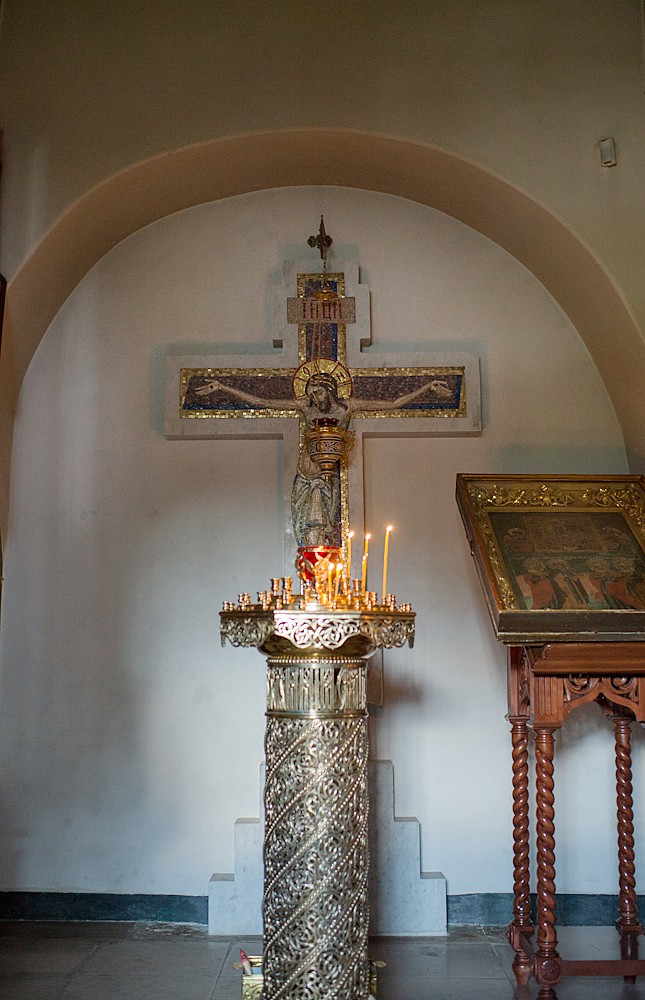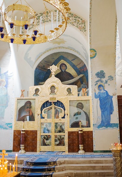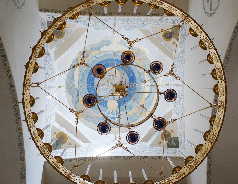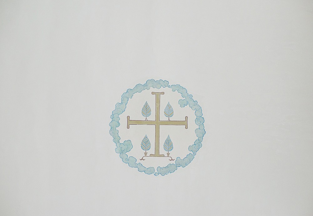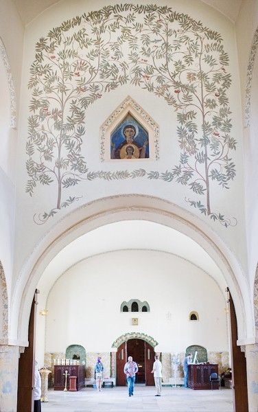 Воздушность и необычайное «свечение» придает внутреннему убранству храма именно то, что росписи не доминируют, они размещены «точечно» — вязь над арками, крест в центре свода, ангел на колонне