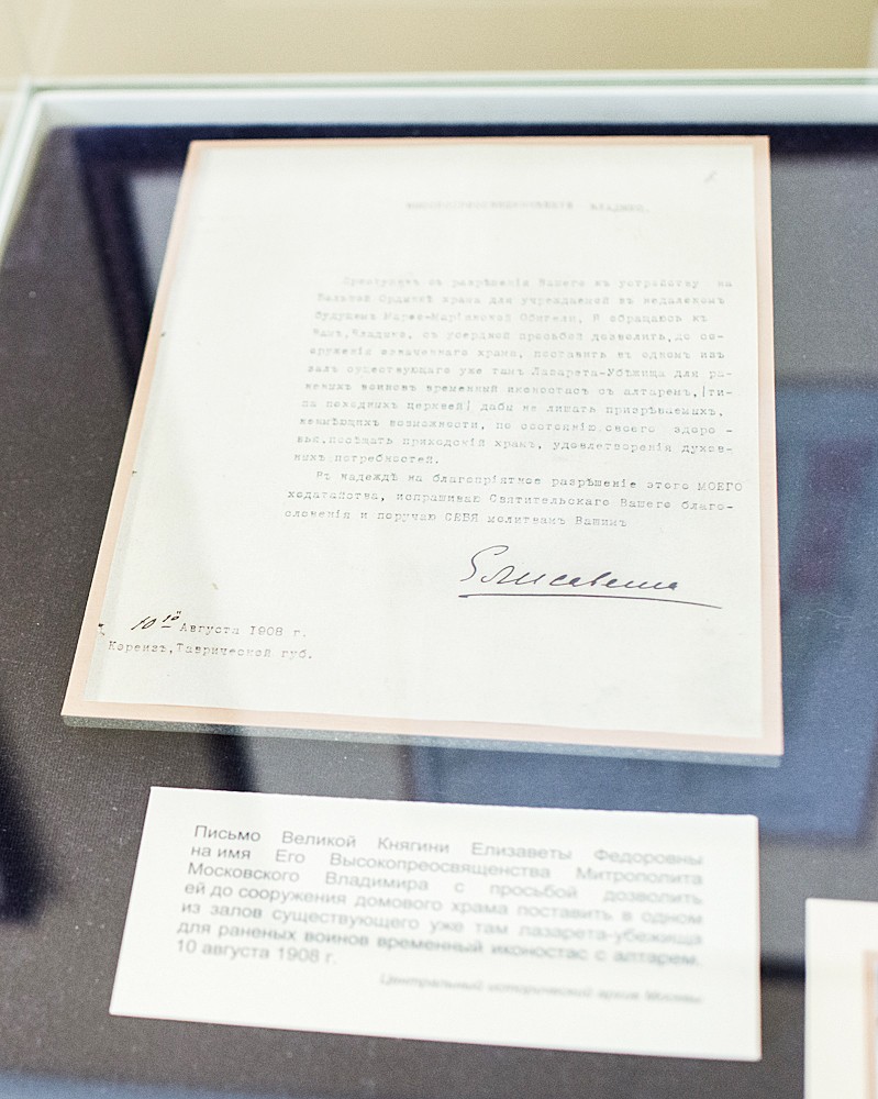 Письмо Великой княгини Елизаветы Федоровны на имя Его Высокопреосвященства Митрополита Московского Владимира с просьбой дозволить ей до сооружения домового храма поставить в одном из залов существующего уже там лазарета-убежища для раненых воинов временный иконостас с алтарем. 10 августа 1908 года