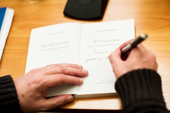 1 апреля в культурном центре «Покровские ворота» состоялась презентация книги «От отца к сыну: Беседы о рискованном деле воспитания» итальянского педагога Франко Нембрини, отца четверых детей, учителя литературы и религии, директора созданной им школы «Ла Трачча» в Бергамо. Вела вечер преподаватель биологии лицея № 1574 Татьяна Бойкова.