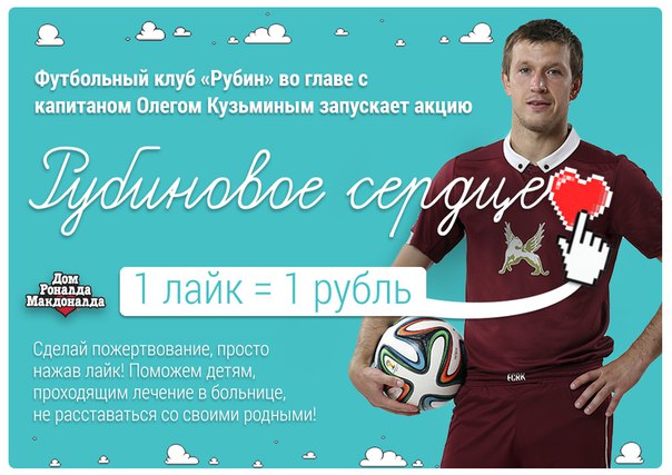 Акцию «Рубиновое сердце» команда организовала на своей странице в «ВКонтакте». Каждый «лайк» под этой записью футболисты обещают превратить в рубль. Вырученные средства будет направлены в «Дом Роналда Макдоналда» в Казани.