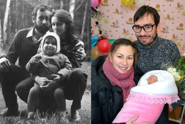 Трёхлетний Андрюша с родителями перед выпиской из клиники (слева). Андрюша с женой и сыном (справа)