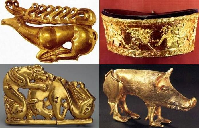 В экспозиции собраны археологические находки, в частности, более 500 экспонатов – артефакты из скифского золота (церемониальный шлем, драгоценные камни, мечи, панцири, домашняя утварь древних греков и скифов), скифское навершие шатра в виде грифона, скифский бронзовый котел и конные украшения, сосуды в виде овец из Нейзацкого некрополя.