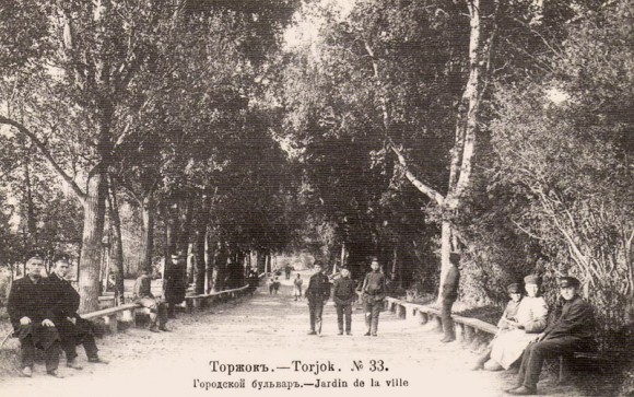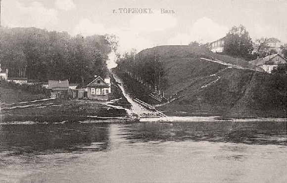 А потом в начале 1930-х годов соорудили там лестницу с каменными ступенями. Сверху был горизонтальный ход, там посадили деревья, поставили скамьи. Начало лестницы оформили двумя гранитными изъятыми из кладбища надгробиями. Ступени для лестницы взяли от церквей (они обычно на насыпных холмах стояли, и к святым вратам вело до десяти ступеней). Цветочки посадили, ноготки слева и справа. А на следующую весну лестница поползла, плохо сделали фундамент. В местной газете «Знамя ударника» появился фельетон на последней странице, что в Торжке метро еще не построили, а эскалатор уже действует.