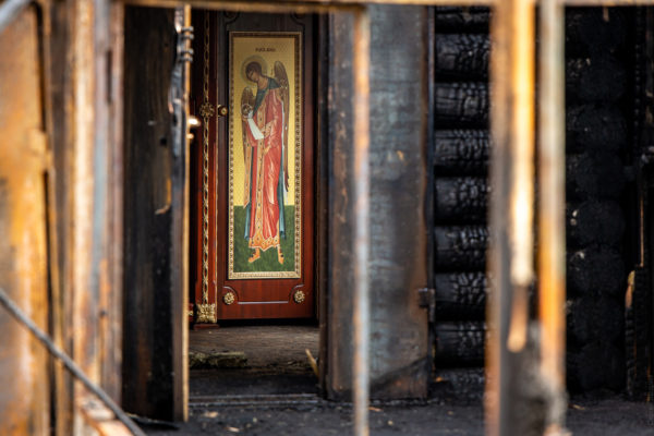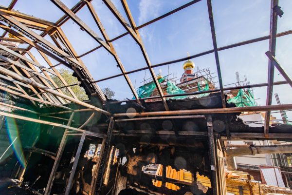 Накануне вечером прихожане спешно заделывали крышу деревянного храма, проломленную пожарными во время тушения, убирали стекла, разносили обугленные бревна, мусор. Все богослужебные книги и практически все облачение сгорели. Остались будничные желтые стихари, да Минея на октябрь. Но все были уверены, праздничная литургия на Покров будет совершаться здесь, в изуродованном пожарищем храме.